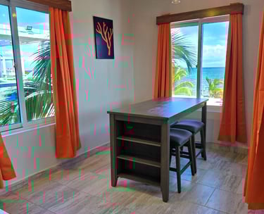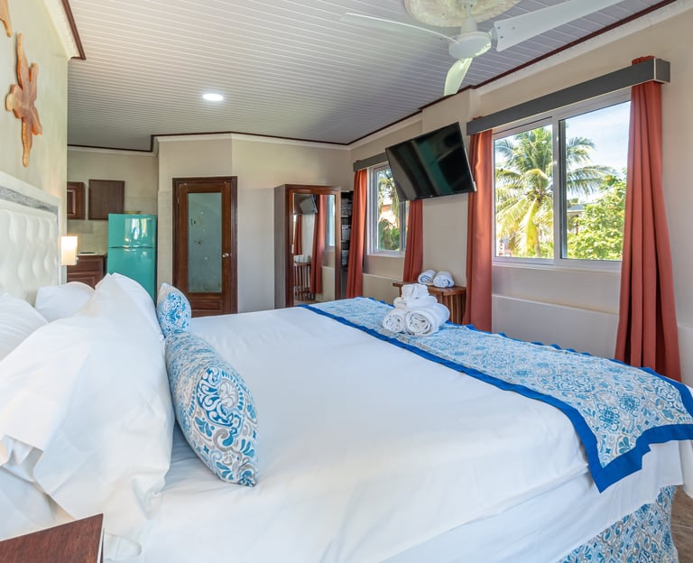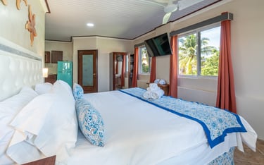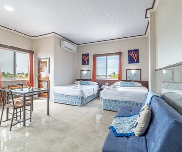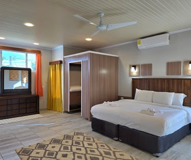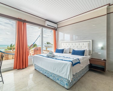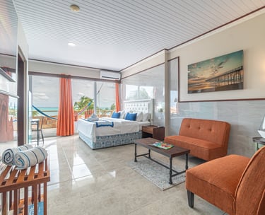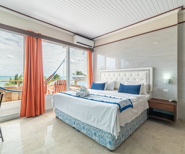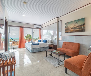 Experience ultimate comfort in our deluxe room, a spacious and private retreat designed for your relaxation. This expansive suite features a luxurious king-size bed, a fully equipped kitchen for your convenience, and a separate, stylishly furnished living room perfect for unwinding. Step out onto your private balcony to enjoy breathtaking, panoramic views of the beach and the ocean.